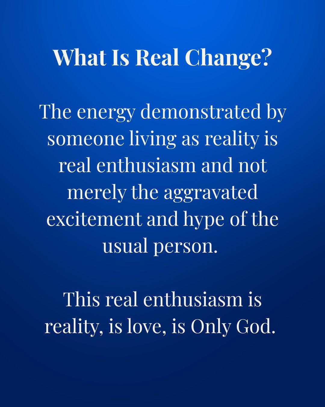 The energy demonstrated by someone living as reality is real enthusiasm and not merely the aggravated excitement and hype of the usual person. This real enthusiasm is reality, is love, is Only God. When we see the steady demonstration of abiding as the mystery of existence in an individual, we are seeing the signs of real change. If we see someone phasing, that is sometimes appearing to be responsible, but mostly collapsing into dramatisation of negative emotions, we are witnessing someone who has not truly changed at all, but at best has been drawn unconsciously by their association with some form of Divine process. It must be utterly understood that responsibility for ourselves as an ‘apparent karmic entity’ must be stably and perpetually demonstrated without fail before we can regard ourselves or be regarded by others as having truly or really changed from the usual unconscious destiny to conscious responsibility that awakens our destiny as Only God.