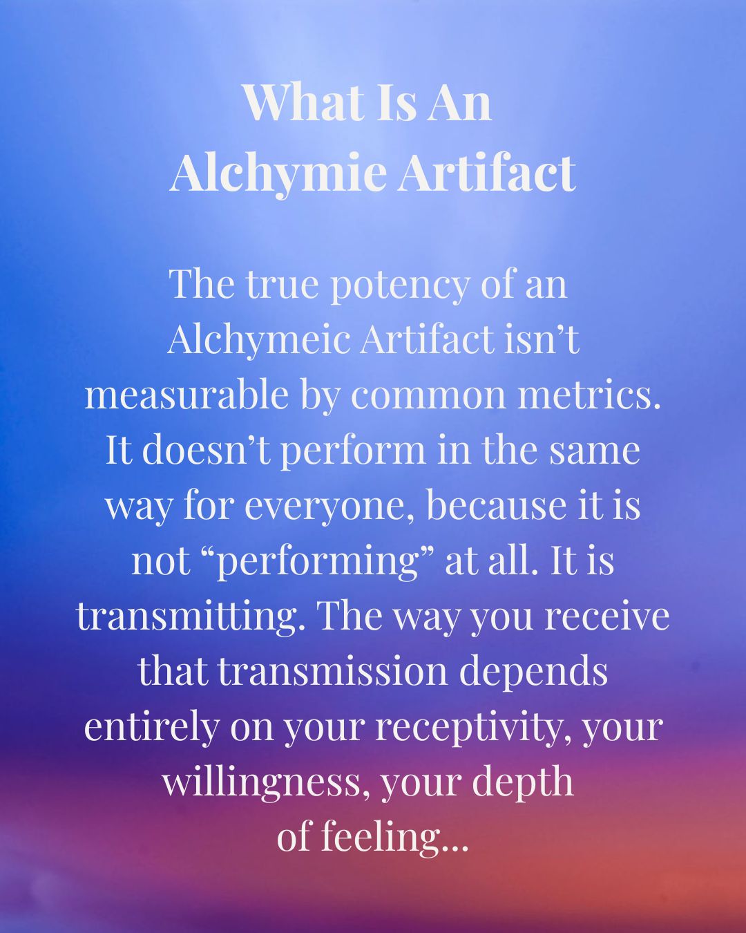 And yet, the true potency of an Alchymeic Artifact isn’t measurable by common metrics. It doesn’t perform in the same way for everyone, because it is not “performing” at all. It is transmitting. The way you receive that transmission depends entirely on your receptivity, your willingness, your depth of feeling.